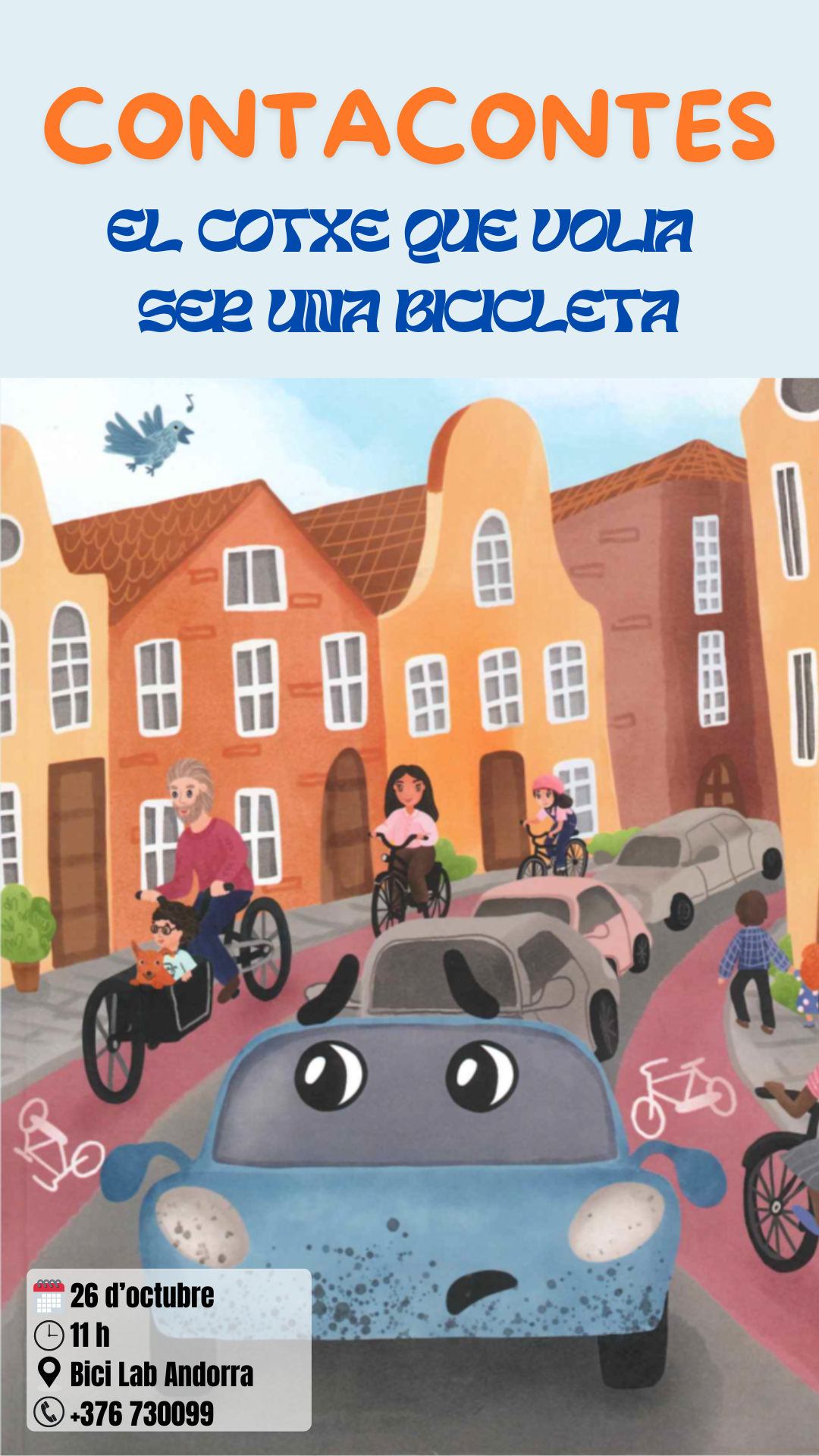 Contacontes sobre mobilitat sostenible dirigit a nens d'entre 3 i 8 anys. Es tracta d'una adaptació del llibre original "The car that wanted to be a bike" i la història s'enllaçarà amb el contacontes "La nena que va aturar el trànsit amb la seva bicicleta" ja narrat a les instal·lacions del museu. L'actuació anirà també a càrrec de 'contaconteslavane'.