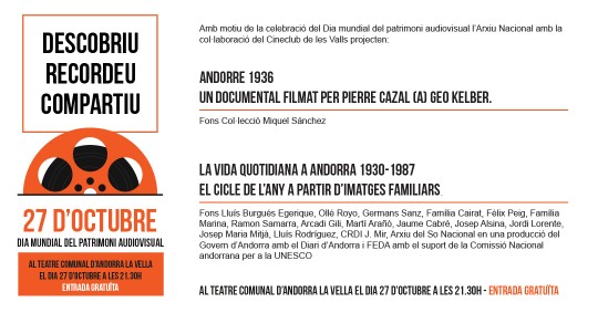 L’activitat que s’organitza és la projecció d’una pel·lícula de l’any 1936 que ha estat rescatada durant el 2016 per un col·leccionista d’Andorra i conservada i digitalitzada per l’Arxiu Nacional. Aquesta pel·lícula correspon a la versió cinematogràfica de la pel·lícula Andorra, de Pierre Cazal (a) Geo Kelber i sobre la base de la qual, fa uns anys, el jove cineasta andorrà Marc Casals va fer i presentar una versió actualitzada. Aquest dia se'n projectarà una versió inèdita a Andorra.
