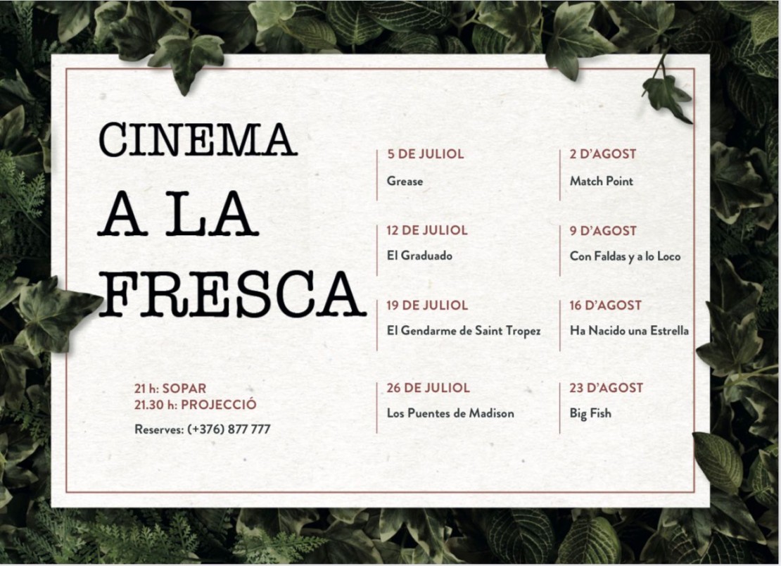 Durant els dimarts de juliol i agost, a les 21.30h, començarà a projectar-se una de les pel·lícules clàssiques seleccionades sota la premissa que siguin cintes entretingudes i fàcils de seguir durant el sopar. Títols com ara Grease, Match Point, El graduado, Con faldas y a lo loco, El gendarme en Saint Tropez, Ha nacido una estrella, Los puentes de Madison i Big Fish.