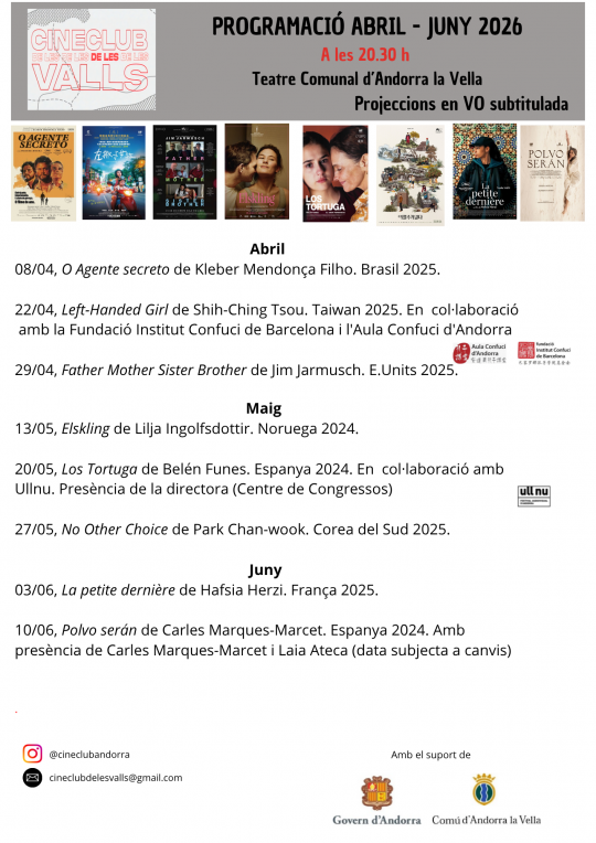 La programació es tanca al juny amb La petite dernière, de Hafsia Herzi, una producció francesa centrada en la construcció de la identitat i els conflictes personals. La temporada culminarà amb Polvo serán, de Carles Marquès-Marcet, amb la presència del director i de la directora d’art, l’andorrana Laia Ateca (data subjecta a canvis), reforçant el vincle directe entre creadors i públic.