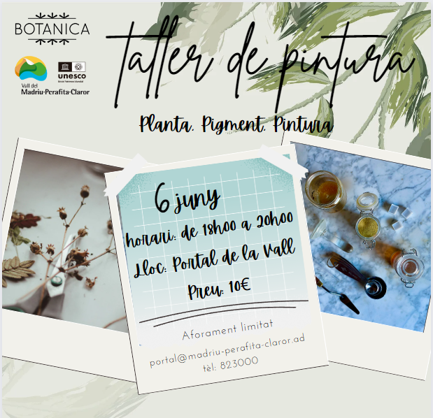 Amb la col·laboració de la Sara Valls de Botànica, hem organitzat el taller de pintura 'Planta, pigment, pintura', en què descobrirem la capacitat colorant d’algunes de les plantes que trobem a la vall i com aquest tint es pot transformar en pigment per fabricar pintures per pintar sobre paper.