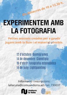 Petites sessions creades per a gaudir jugant amb la llum i el material sensible, que ens premetran crear imatges/dibuixos llum. Ens iniciarem amb els quimigrames, continuarem amb els fotogrames amb la Cianotípia(tècnica fotogràfica del s.XIX), la fotografia estenopeica per fer fotografies amb una caixa de patates i el lightpainting.