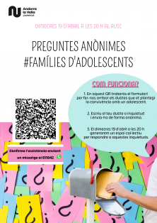 Conviure amb un adolescent a casa pot generar certes inquietuds o neguits, per aquest motiu des del Servei de Joventut d'Andorra la Vella proposem un espai per a famílies per compartir aquests dubtes i de forma col·lectiva buscar maneres de millorar. Ens acompanyarà i guiarà la Yolanda Blanco, psicòloga infantojuvenil del CRAC (Consulta Ràpida d'Adolescents en Crisi)