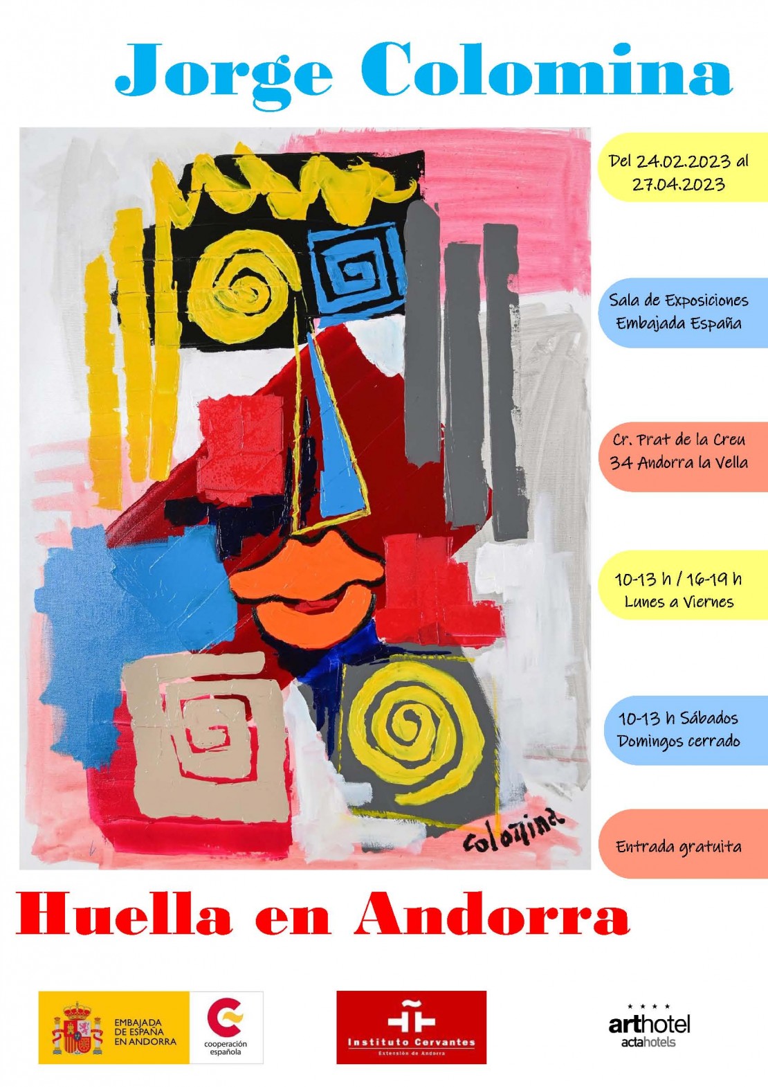 El 23 de febrer de 2023 s’inaugurarà l’exposició de pintura titulada “Huella en Andorra”, de Jorge Colomina. Pintor espanyol autodidacta instal·lat a Nîmes (França) i de reconeixement internacional, Colomina s’inspira en artistes de renom universal com ara Picasso, Miró, Cézanne o Matisse, entre d’altres.
