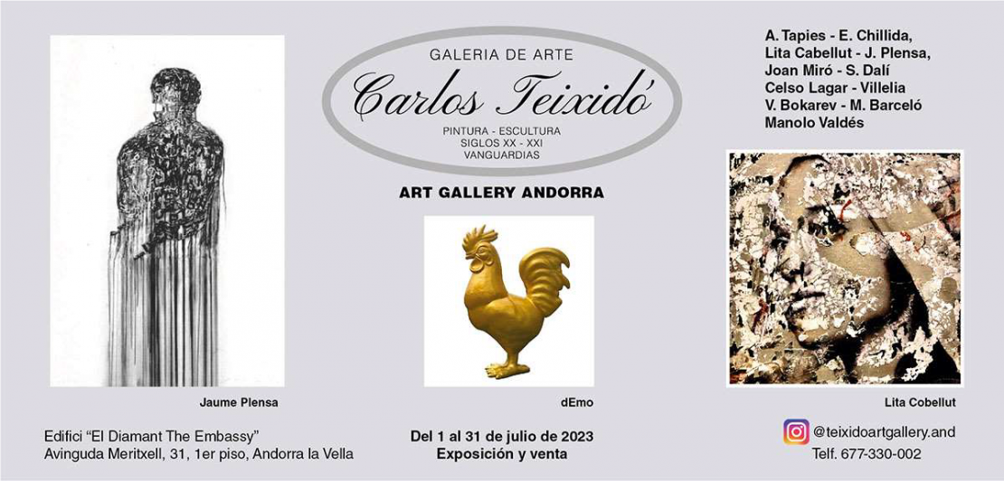 L’emblemàtica galeria barcelonina Carlos Teixidó, especialitzada en avantguardes de “l’Escola de París”, “entre Guerres” i “art contemporani”, obre exposició per primera vegada a Andorra i s’instal·la a The Embassy amb una mostra d’obres de grans noms de la història de l’art que parteixen de les primeres avantguardes i ens porten als nostres dies.