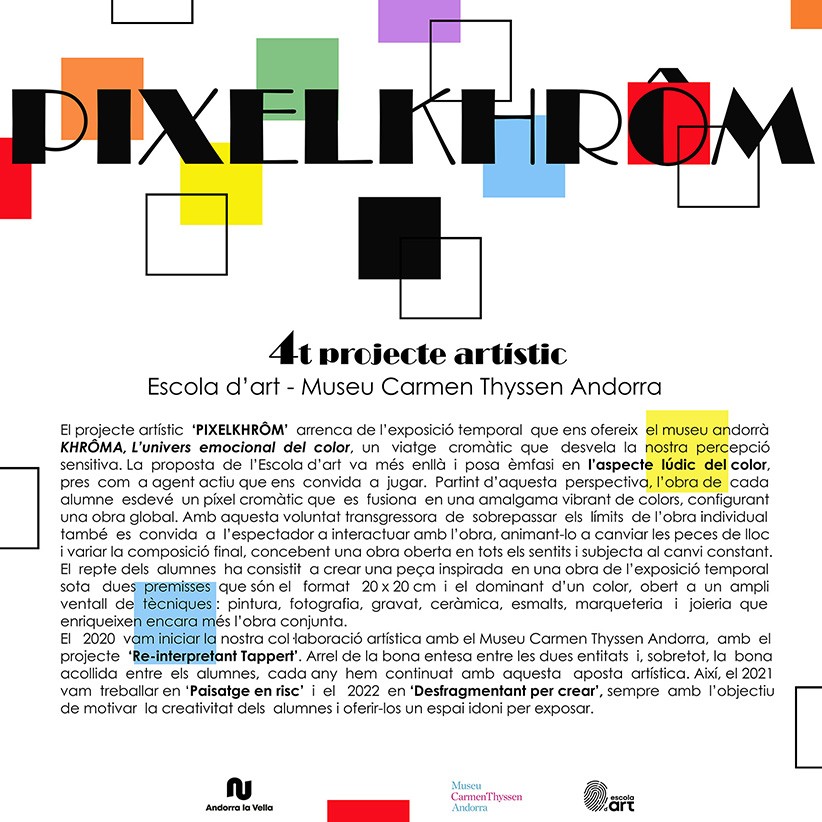 El projecte artístic 'Pixelkhrôm' arrenca de l'exposició temporal que ens ofereix el museu andorrà Khrôma, l'univers emocional del color, un viatge cromàtic que desvela la nostra percepció sensitiva.