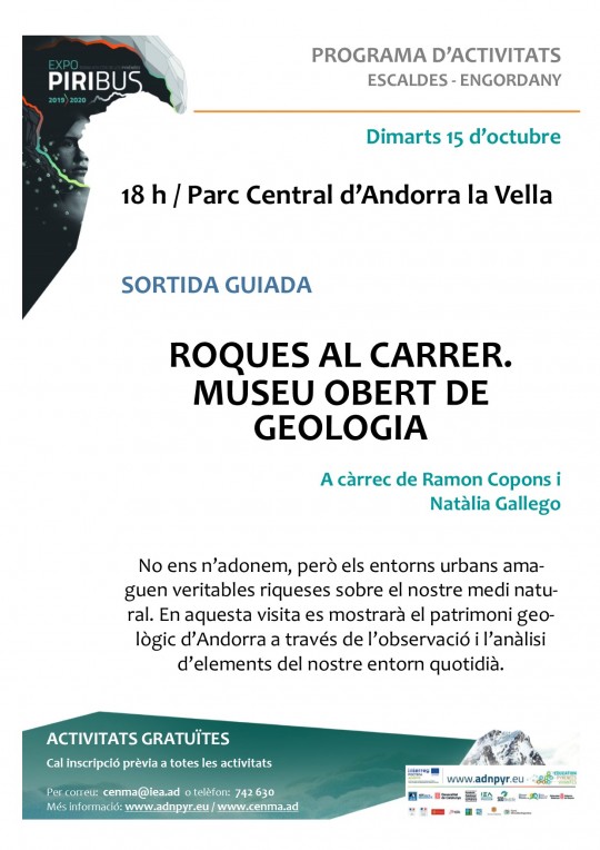 No ens n’adonem, però els entorns urbans amaguen veritables riqueses sobre el nostre medi natural. En aquesta visita es mostrarà el patrimoni geològic d’Andorra a través de l’observació i l’anàlisi d’elements del nostre entorn quotidià.