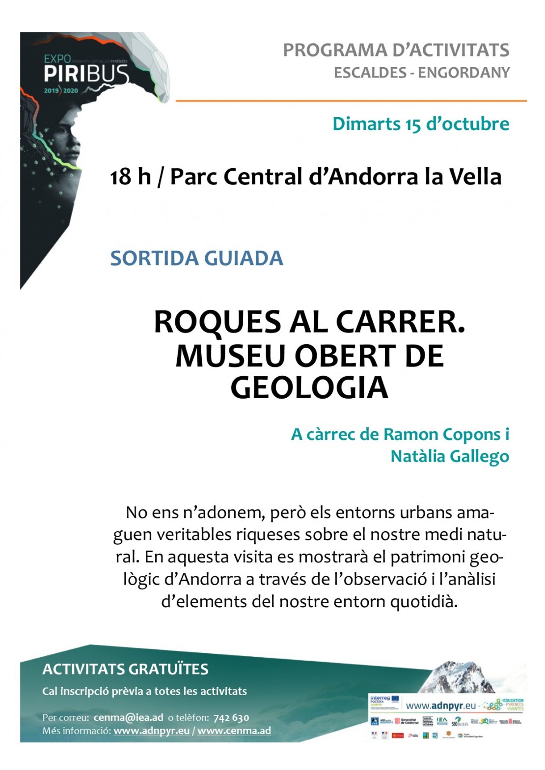 Activitat emmarcada en l’exposició itinerant PIRIBUS “Viatge al cor dels Pirineus”, instal·lada entre el 7 i el 20 d’octubre al Parc infantil d’Escaldes-Engordany.A les 18 h