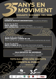 19 h Gala esportiva 35è aniversari. Demostració esportiva, projecció d'imatges, reconeixement als fundadors i aperitiu.