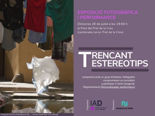 L’institut Andorrà de les Dones, amb el suport d’un grup d’artistes i fotògrafes compromeses i el patrocini del Comú d’Andorra la Vella, us convida a participar en la performance i inauguració de l’exposició al carrer 'TRENCANT ESTEREOTIPS'.
