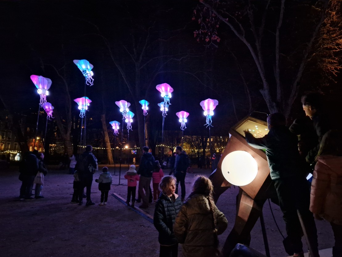 Aquesta peça artística és una escenografia poètica i lluminosa on el públic pot ser tant actor com espectador. És un recordatori monumental de totes les petites criatures boniques i bioluminescents que s’amaguen a les profunditats, potser no tan lluny de nosaltres. També és una reflexió sobre la nostra connexió amb la fauna salvatge que és invisible als nostres ulls i que, tanmateix, està greument amenaçada per la sobrepesca i l’acidificació dels oceans.