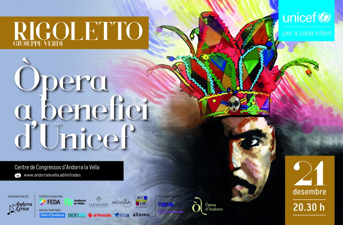 ‘Rigoletto’, de Giuseppe Verdi, produïda per Andorra Lírica. Una iniciativa impulsada pel Comitè Nacional d’Andorra per l’Unicef amb el patrocini del Comú d’Andorra la Vella, FEDA, Lucas Fox, Jet Consult i Art Lab.
