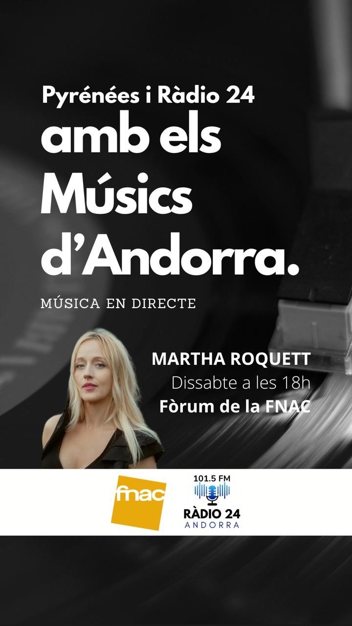 L’actuació, organitzada amb el suport de Ràdio 24 Andorra, forma part de la col·laboració amb FNAC Pyrénées, que aposta clarament pel talent musical del país i l’oferta cultural de qualitat. Martha Roquett oferirà un concert íntim i emotiu, amb un repertori que connecta amb el públic des del primer acord.