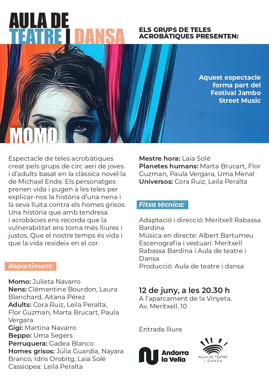 Espectacle de teles acrobàtiques creat pels grups de circ aeri de joves i d’adults basat en la clàssica novel·la de Michael Ende. Els personatges prenen vida i pugen a les teles per explicar-nos la història d’una nena i la seva lluita contra els homes grisos.
