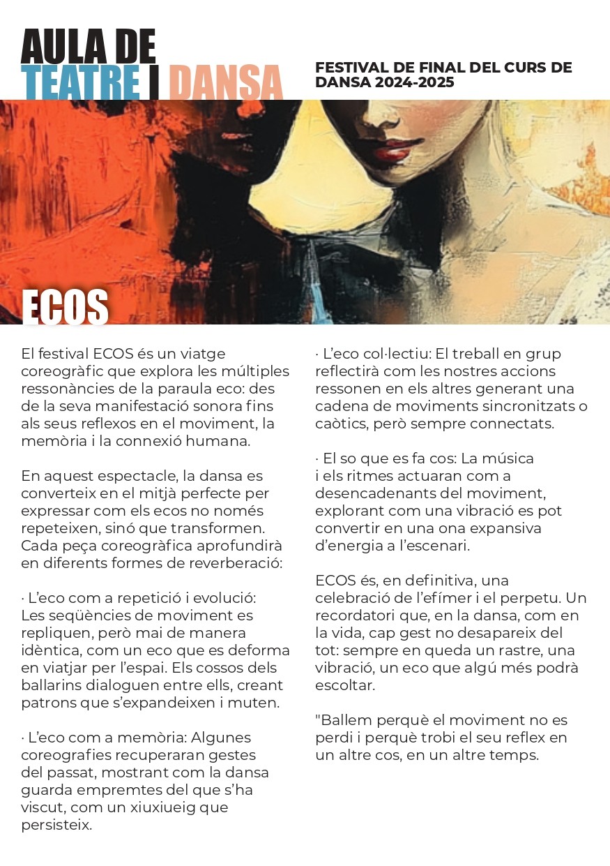 El festival ECOS és un viatge coreogràfic que explora les múltiples ressonàncies de la paraula eco: des de la seva manifestació sonora fins als seus reflexos en el moviment, la memòria i la connexió humana. En aquest espectacle, la dansa es converteix en el mitjà perfecte per expressar com els ecos no només repeteixen, sinó que transformen.