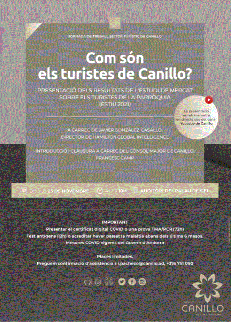 Per assistir a la presentació de les conclusions de l'estudi és necessari confirmar assistència enviant un correu electrònic a i.pacheco@canillo.ad, o bé trucant al telèfon +376 751 090. La jornada de treball dirigida als agents del sector turístic és sota invitació.