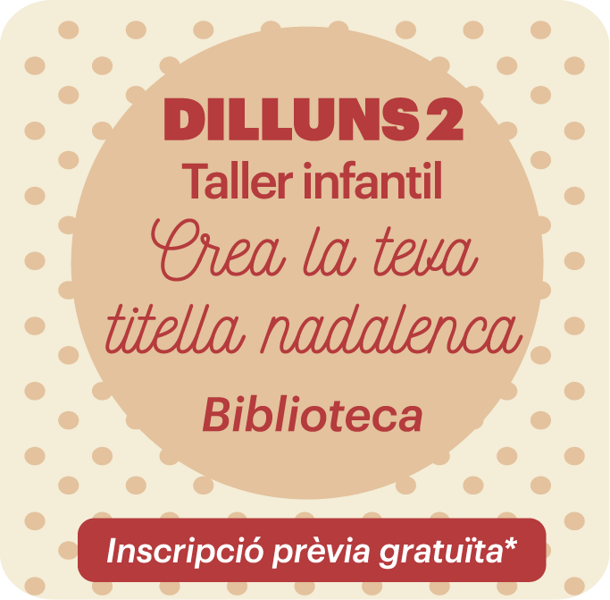 Els més petits podran divertir-se donant vida a titelles nadalenques! Guiats per Cecília Santañes, els infants crearan personatges entranyables de les festes, com el Tió o els Reis, en una activitat creativa i plena de color. Un taller especial per despertar la imaginació i celebrar el Nadal d’una manera única!