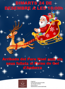 Sortida 18 h del Pare Noel amb trineu i gossos de l'aparcament del Comú amb arribada al Palau de Gel. Tot seguit els nens i nenes de l'Andorra Club Gel rebran, a la pista de gel, el Pare Noel amb un espectacle de patinatge. Un cop hagin acabat, el Pare Noel rebrà a tothom a la pista de gel.
