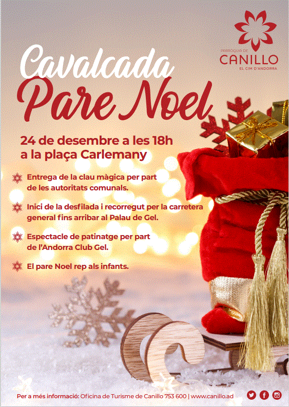 Sortida del Pare Noel davant del Comú de Canillo amb arribada al Palau de Gel. Tot seguit els nens i nenes de l'Andorra Club Gel rebran a la pista de gel el Pare Noel amb un espectacle de patinatge. Un cop hagin acabat, el Pare Noel rebrà a tothom a la pista de gel.