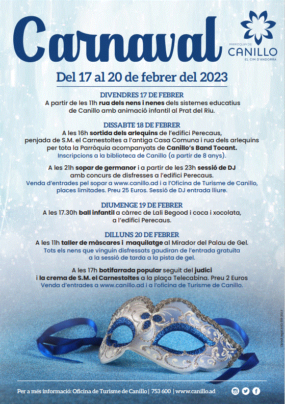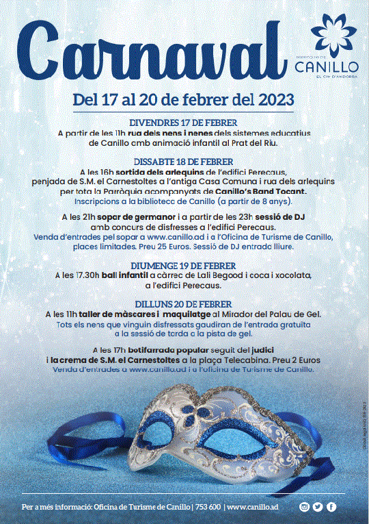 A partir de les 11h rua dels nens i nenes dels sistemes educatius de Canillo amb animació infantil “Visca el Carnaval – ai Carai” al Prat del Riu.