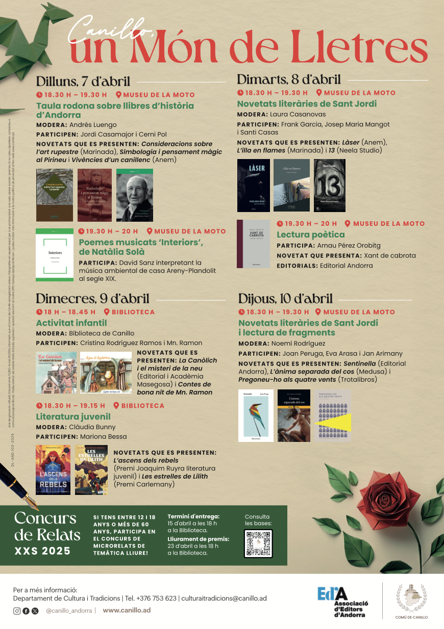 Amb motiu de la proximitat de Sant Jordi, arriba a Canillo la segona edició Canillo, un Món de Lletres, on podreu gaudir de diferents activitats culturals adreçades a tota mena de públic, sigui adult, juvenil o infantil.