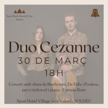 Concert protagonitzat pel Duo Cezane, guanyadors del 2n premi del Concurs Internacional Cambra Romànica, de 2023. Aquest concert està ofert per l’Sport Hotel Village, per la col·laboració entre l’associació i l’hotel en fomentar les oportunitats als joves músics, oferint un concert al grup guanyador del concurs de l’any anterior.