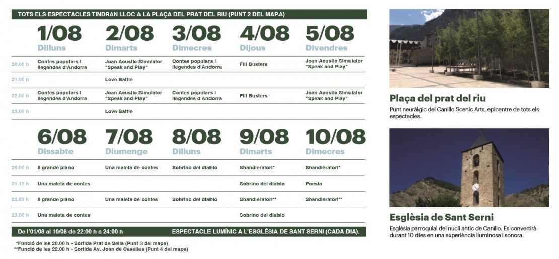 Canillo Scenic Arts vol servir d'aparador per a artistes locals i internacionals, i pretén acostar al públic un ampli ventall de propostes creatives, originals i innovadores vinculades a les arts escèniques
