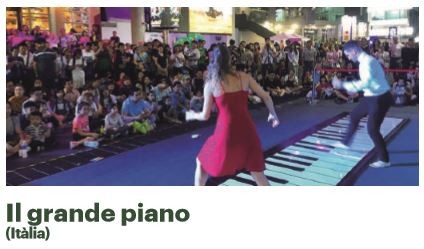 Dos ballarins talentosos toquen amb els seus peus un piano gegant, recolzat a terra, en un bell ball.