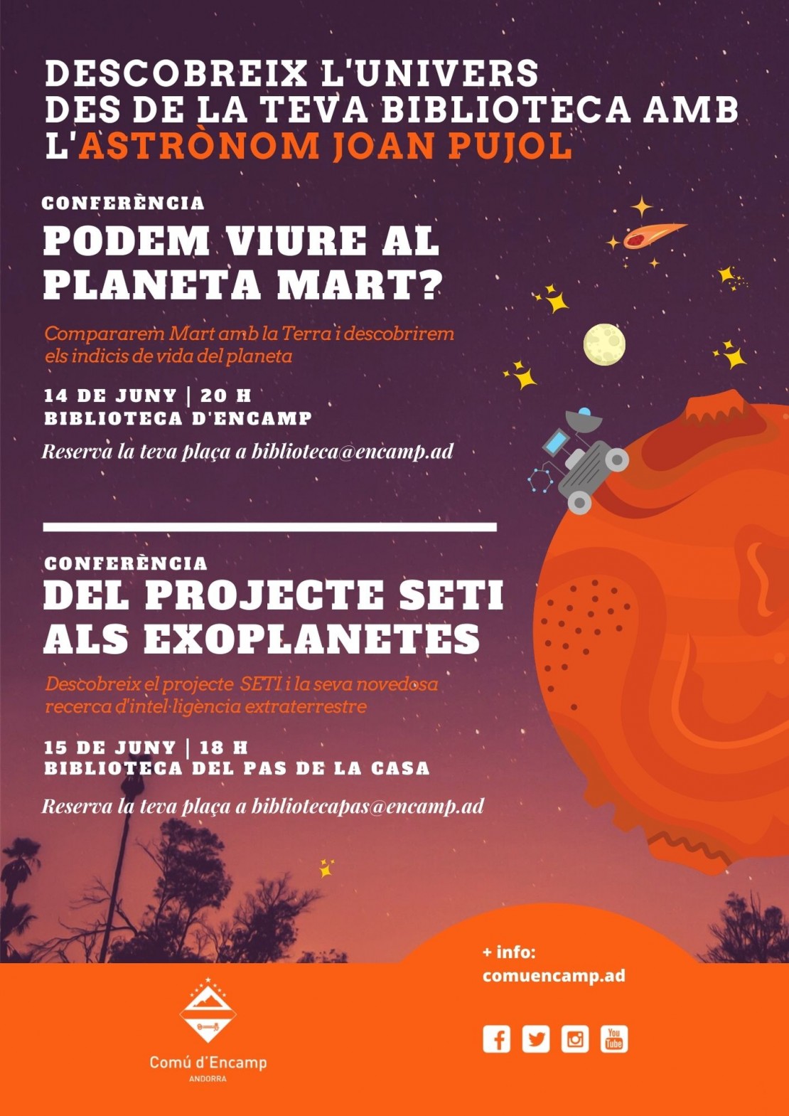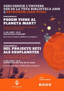 18h “Del projecte SETI als exoplanetes”. Conferència per a tots el públics. A la tarda, Joan Pujol farà una conferència adreçada a tot el públic a les instal.lacions de la Biblioteca del Pas de la Casa. L’aforament és limitat i cal reservar plaça.