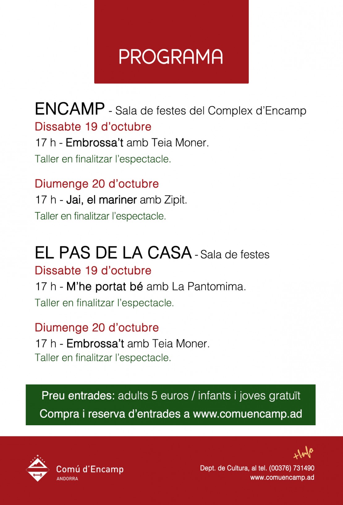 El tret de sortida el donaran, dissabte 19 d'octubre a les cinc de la tarda, els espectacles "Embrossa't" de Teia Moner, que es farà a la sala de festes del Complex d'Encamp, i "M'he porta't bé" de la companyia Pantomima, a la sala de festes del Pas de la Casa. Diumenge 20 d'octubre, també a les cinc de la tarda, les famílies podran gaudir dels espectacles "Jai, el mariner" de la companyia Zipit a Encamp i, a la mateixa hora al Pas de la Casa, d' "Embrossa't" de Teia Moner.