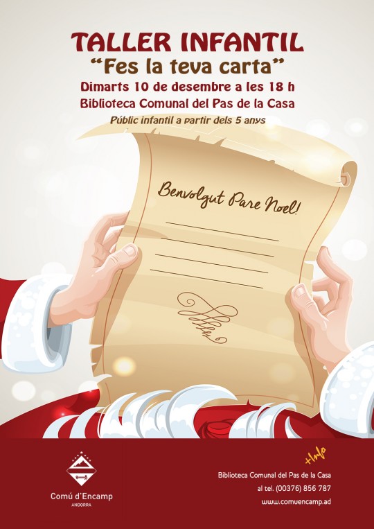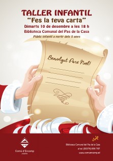 T'esperem a la Biblioteca Comunal del Pas de la Casa per fer un taller on escriurem la carta al Pare Noel i als Reis Mags. I no serà una carta qualsevol, perquè hi escriurem, no només aquelles joguines que tant desitgeu, sinó que també escriurem missatges per demanar coses especials.