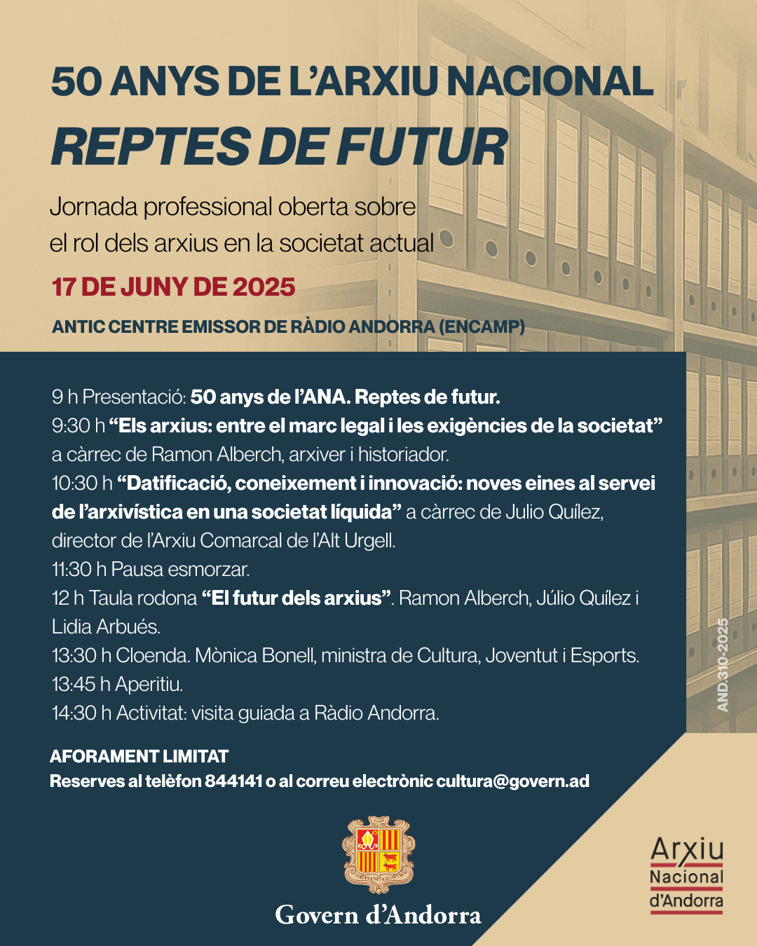 Se celebrarà a la sala dels emissors de Ràdio Andorra, de 9 h a 15 h, i comptarà amb les ponències dels arxivers Ramon Alberch, un dels grans especialistes en arxivística a nivell internacional, que farà la conferència, Els arxius: entre el marc legal i les exigències de la societat i Julio Quílez, director de l’Arxiu Comarcal de l’Alt Urgell, que parlarà sobre Datificació, coneixement i innovació: noves eines al servei de l’Arxivística en una societat líquida, i amb una taula rodona en la qual els convidats, juntament amb Lidia Arbués, responsable de l’Arxiu Nacional, debatran sobre el futur dels arxius. La jornada es clourà amb una visita guiada a Ràdio Andorra.