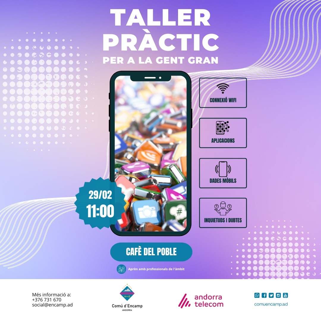 El Comú d'Encamp, juntament amb Andorra Telecom, organitza un taller pràctic per a la gent gran el 29 de febrer, a les 11:00 al Café del Poble. Una oportunitat per aprendre sobre la tecnologia mòbil de la mà d'autèntics professionals d'aquest àmbit.