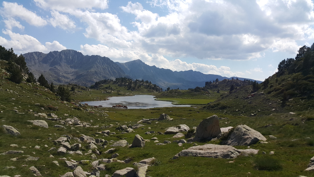 Ens trobarem a les Pardines, als cortals d’Encamp. Guanyarem alçada fins arribar al cap de Montuell (2.422 m) on ens aturarem a contemplar un extens paisatge. A continuació, resseguirem la carena fins passar el cap dels Agols i endinsar-nos a les planures de la capçalera del Madriu que ens duran fins a l’estany Forcat (2.539 m). Farem aquí una llarga parada per poder apreciar aquest indret singular. La tornada es farà per la vall dels Agols. El seu agradable camí ens portarà fins al punt d’inici a través de prats i boscos.