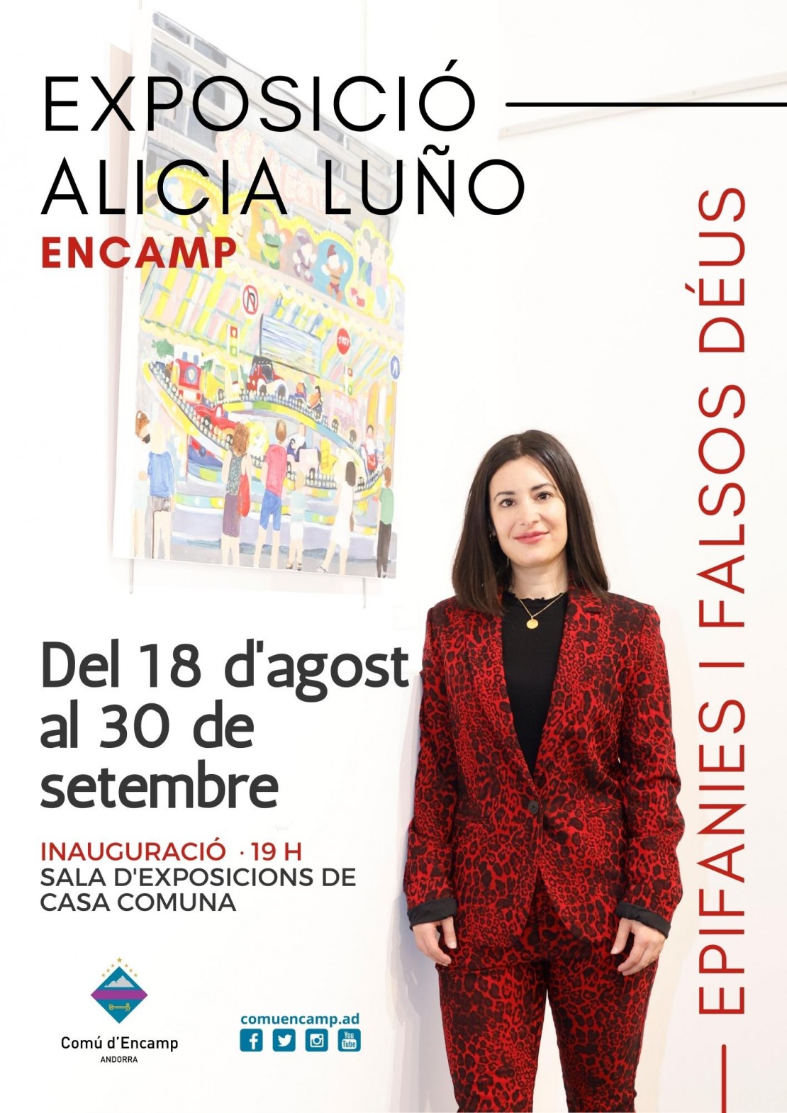 Es tracta de la segona exposició organitzada en solitari per la jove artista, Alicia Luño, la qual va batejar com ‘Epifanies i falsos deus'. En aquesta s’hi representen, a través de dotze pintures treballades amb acrílics sobre llenç i una mica de pastel, paisatges i elements de la fisonomia andorrana que sovint s’hi reconeixen i altres vegades no, i que té la voluntat de fer reflexionar al públic sobre la importància que donem als elements urbans i totèmics per sobre de la natura.