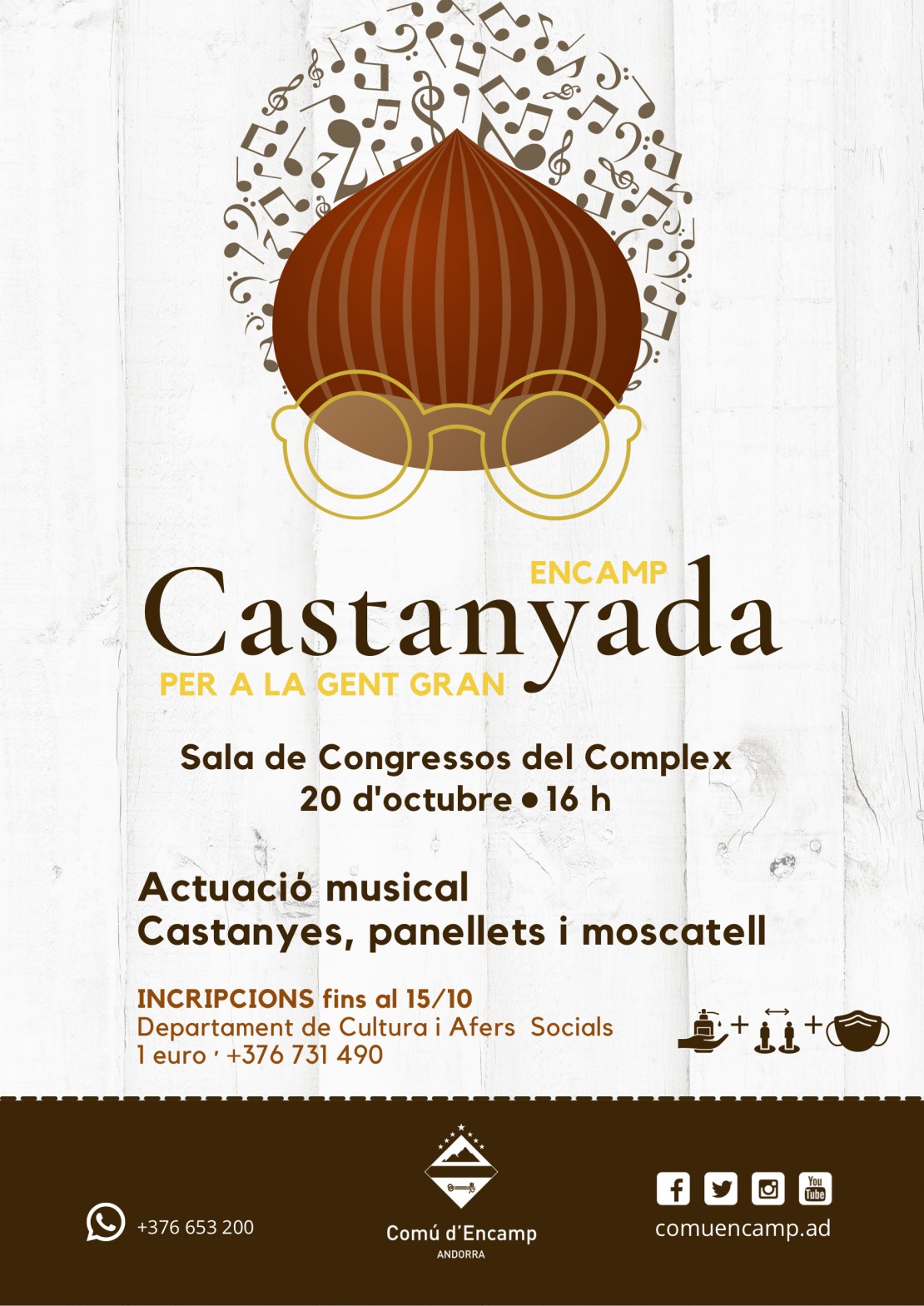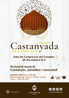Encamp celebra la 'Castanyada per a la gent gran' amb una actuació musical, castanyes, panellets i moscatell. L'esdeveniment es realitzarà a la Sala de Congressos del Complex d'Encamp el dia 20 d'octubre a les 16.00 hores.