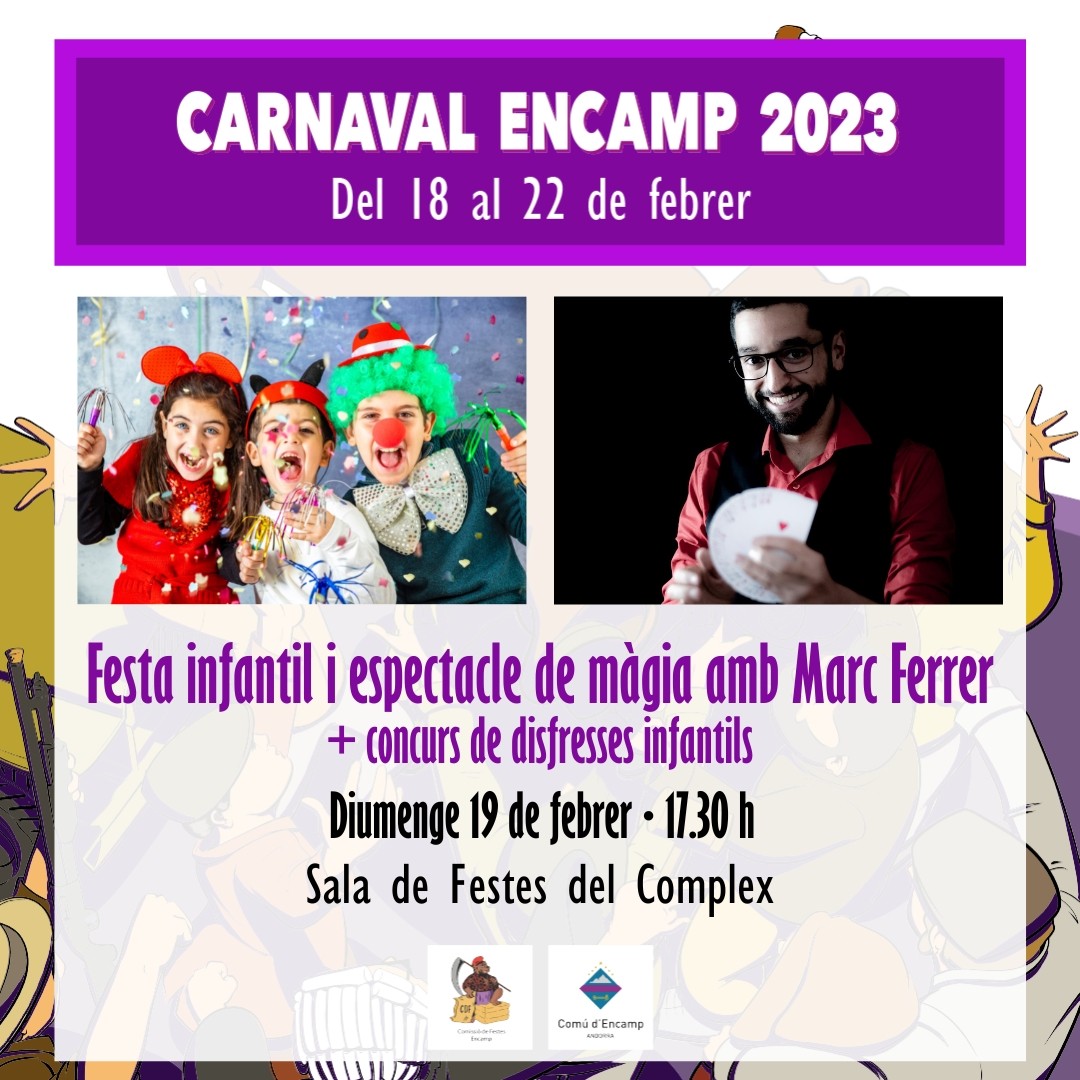 La Sala de Festes del Complex d'Encamp acollirà una festa infantil de Carnaval per als més menuts i l'espectacle de màgia del gran Marc Ferrer, que ens sorprendrà a tots amb els seus trucs inimaginables!