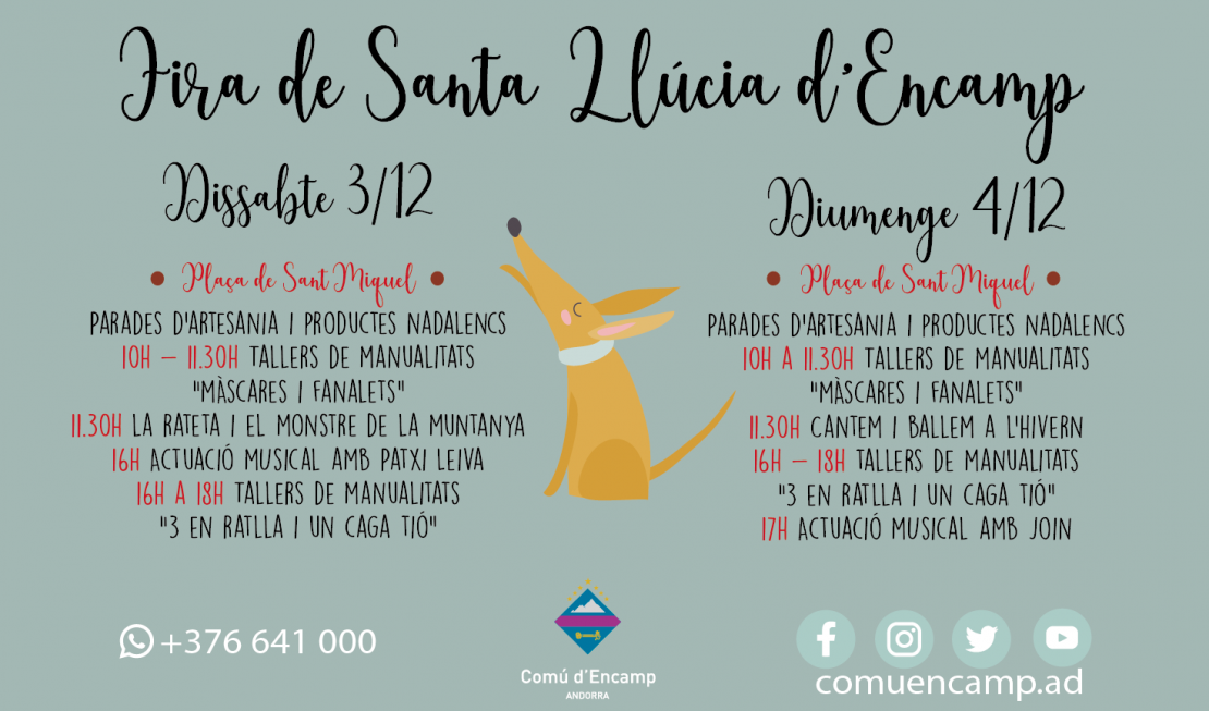 Torna la Fira de Santa Llúcia d'Encamp el cap de setmana del 3 i 4 de desembre. Durant aquests dos dies, la plaça de Sant Miquel s’omplirà d’artesania i venda de productes nadalencs. Un mercat amb les casetes de fusta situades al mig de la plaça.