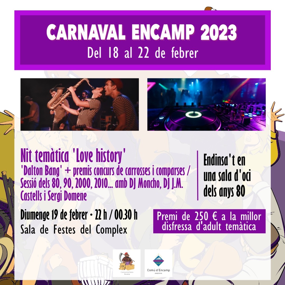 La segona festa amb estil propi serà 'Love history', que tindrà lloc el diumenge 19 de febrer a partir de les 22 h. La Sala de Festes del Complex d'Encamp es convertirà en una sala d'oci dels anys 80! A més, durant la nit hi haurà l'actuació del grup de versions 'Dalton Bang', l'entrega de premis del concurs de carrosses i comparses i una festa cronològica dels anys 80, 90, 2000, 2010... amb DJ Moncho, DJ J.M. Castells i Sergi Domene.