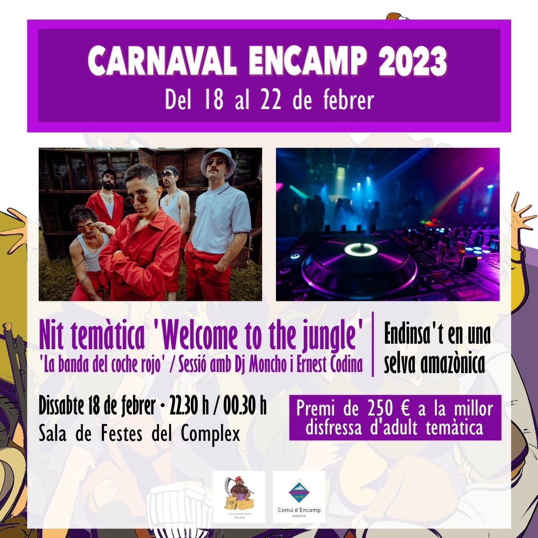 La primera festa amb estil propi serà 'Welcome to the jungle', que tindrà lloc el dissabte 18 de febrer a partir de les 22.30 h. La Sala de Festes del Complex d'Encamp es convertirà en una selva amazònica! A més, durant la nit hi haurà l'actuació del grup de versions 'La banda del coche rojo' i, posteriorment, una sessió de disc joqueis amb DJ Moncho i Ernest Codina.