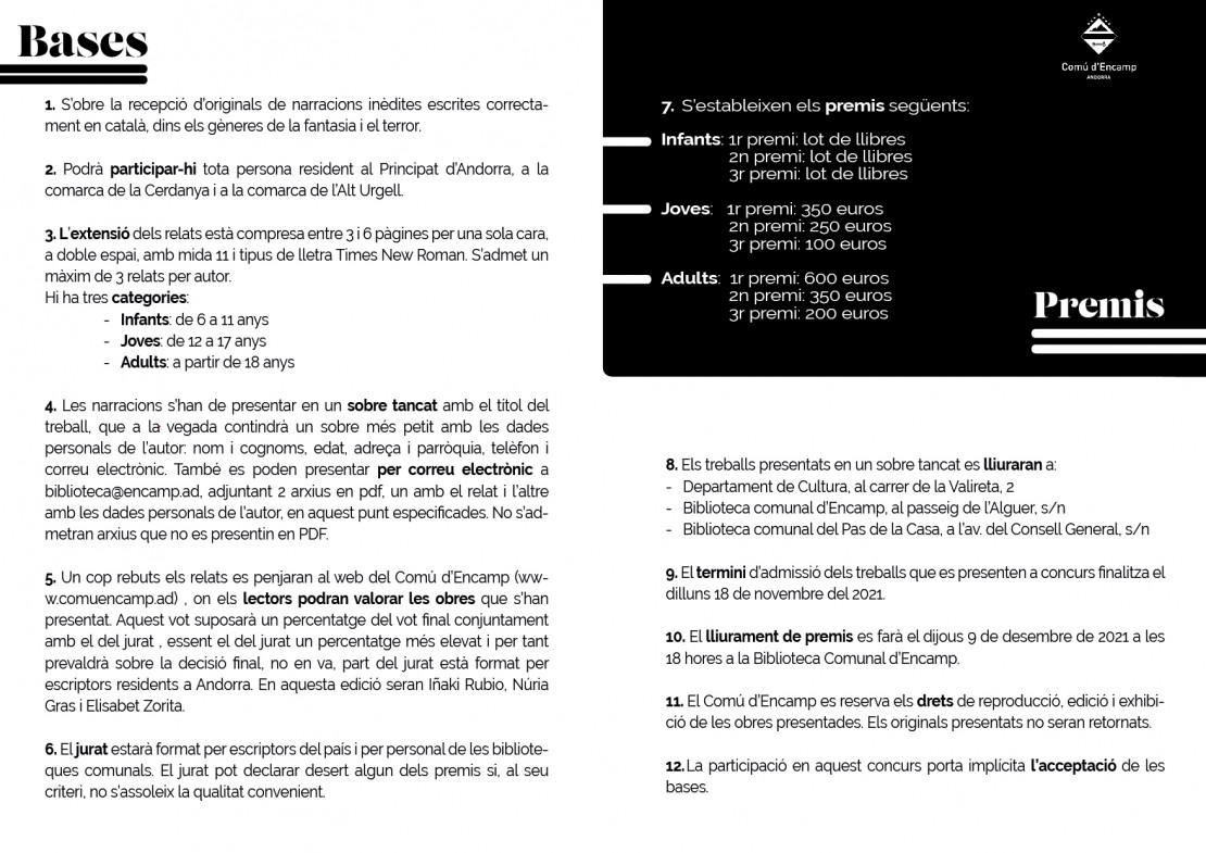 Pel que fa a les bases del concurs, l’extensió dels treballs escrits, que han de ser narracions inèdites i correctament escrites en català, ha d’estar compresa entre 3 i 6 pàgines per una sola cara, a doble espai, amb mida 11 i tipus de lletra ‘Times New Roman’, i s’admetran un màxim de tres relats per persona. Hi haurà tres categories, infants -de 6 a 11 anys-, joves -de 12 a 17 anys-, i adults -a partir de 18 anys.
