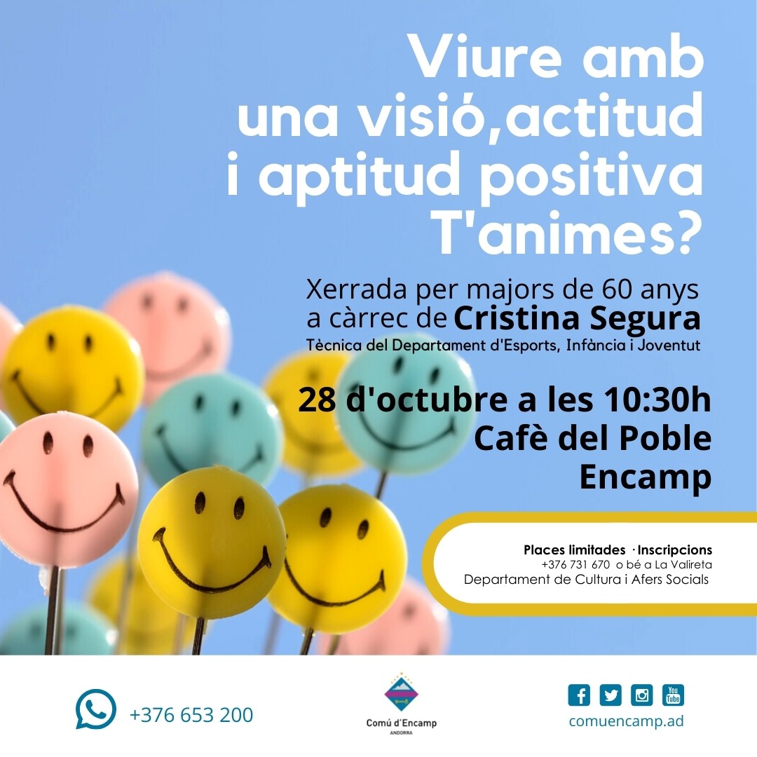 El Departament de Cultura i Afers Socials del comú d'Encamp organitza la xerrada 'Viure amb una visió, actitud i aptitud positiva’ per a majors de 60 anys.