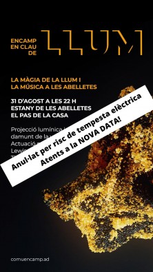 La projecció d'aquesta nit al Pas de la Casa queda anul·lada a causa de la pluja i pel risc de tempesta elèctrica anunciat per Protecció Civil. L'espectacle es reprogramarà, per tant estigueu atents a la nova data!