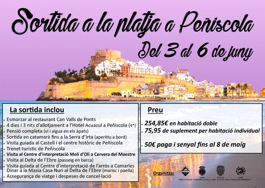 El Departament de Socials del Comú d'Encamp ha obert les inscripcions per apuntar-se a la sortida interparroquial per a la gent gran que se celebrarà del 3 al 6 de juny i que tindrà com a destinació Peníscola, en un viatge de germanor amb els padrins i les padrines d'Andorra la Vella, Sant Julià de Lòria i Escaldes-Engordany.