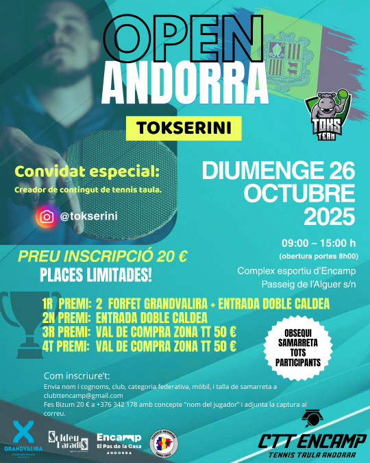 L’Open de tennis taula d’Andorra torna el diumenge 26 d’octubre al Complex Esportiu d’Encamp amb una edició molt especial. Enguany comptarà amb la presència de Tokserini, nom artístic de Tomás Cabrera, creador de contingut a Instagram (@tokserini). Cabrera, que viu a l'Argentina, ha iniciat un viatge per Europa amb l’objectiu de fer realitat el seu repte de convertir-se en jugador professional de tennis de taula, i Andorra és una de les seves aturades abans de participar al prestigiós World Table Tennis Feeder Vila Nova de Gaia 2025, a Portugal.