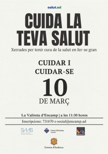 En el marc del cicle de xerrades 'Cuida la teva salut' que està promovent el Ministeri de Salut, La Valireta d'Encamp acollirà el 10 de març, a les 11:30 h, una nova xerrada dirigida a la gent gran. En aquesta ocasió, el títol de la xerrada serà 'Cuidar i cuidar-se'.
