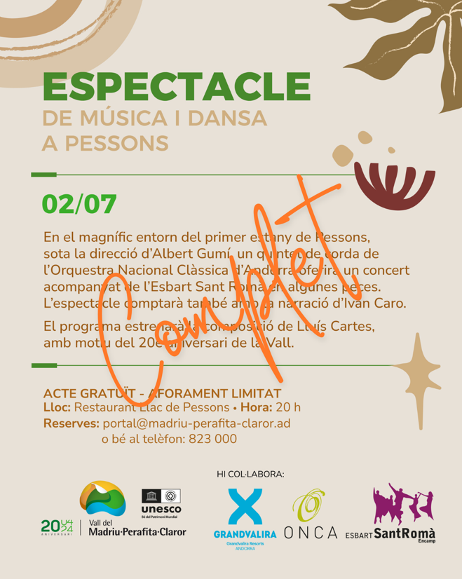 En el magnífic entorn del primer estany de Pessons, sota la direcció d'Albert Gumí, un quintet de corda de l'Orquestra Nacional Clàssica d'Andorra oferirà un concert acompanyat de l'Esbart Sant Romà en algunes peces. L'espectacle comptarà també amb la narració d'Ivan Caro.