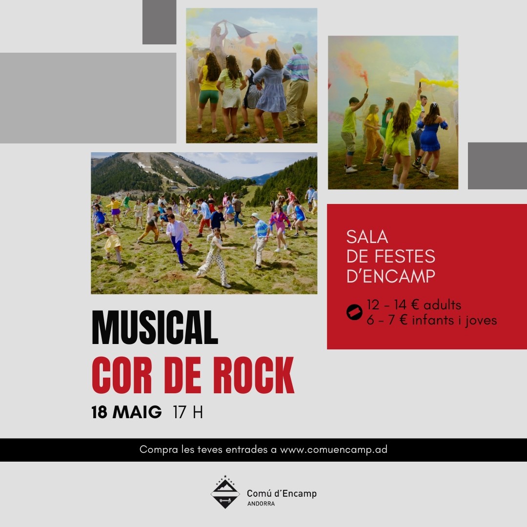 El Cor de Rock oferirà un musical el 18 de maig, a les 17 h, a la Sala de festes del Complex Esportiu i Sociocultural d'Encamp. Esteu atents, perquè hi haurà sorpreses! El grup estarà acompanyat d'uns artistes molt especials!