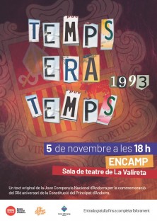 Temps era temps... 1993 és una obra que sintetitza més de 500 anys d'història andorrana en un format jove, accessible i una mica trapella. Amb un elenc de dos actors, dos actrius i un músic, la JOCAND ha aconseguit transmetre la passió i el talent a través d'una narrativa teatral que captivarà l'audiència.