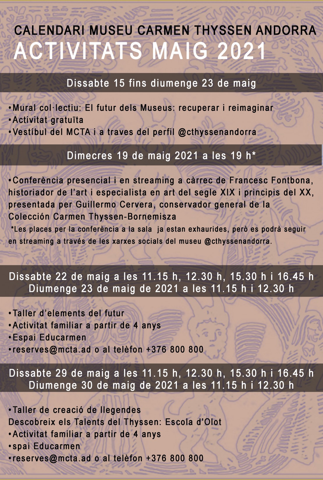 El públic familiar descobrirà a través de la Llegenda del pic de les Bruixes la fantasia del paisatge que va inspirar els artistes del S.XIX, com Joaquim Vayreda o Ramon Martí y Alsina, i que trobem en l'exposició actual "Talents amb denominació d'origen. De Rigalt a Puigdengolas", de la Col·lecció d’Art de Crèdit Andorrà i la Colección Carmen Thyssen-Bornemisza.